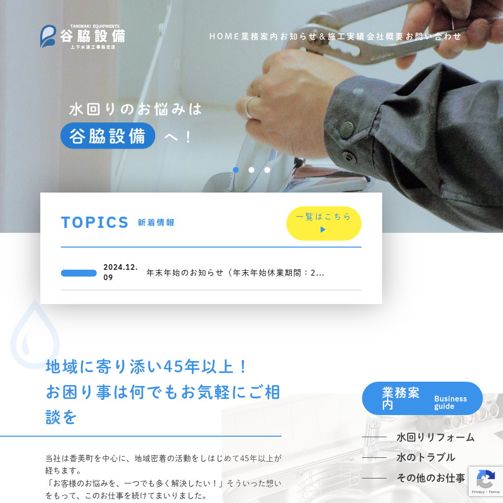 谷脇設備は、兵庫県姫路市・美方郡香美町で水回りリフォームや水漏れ・排水管のつまり、漏水調査・修理、給湯器の交換・修理に対応。