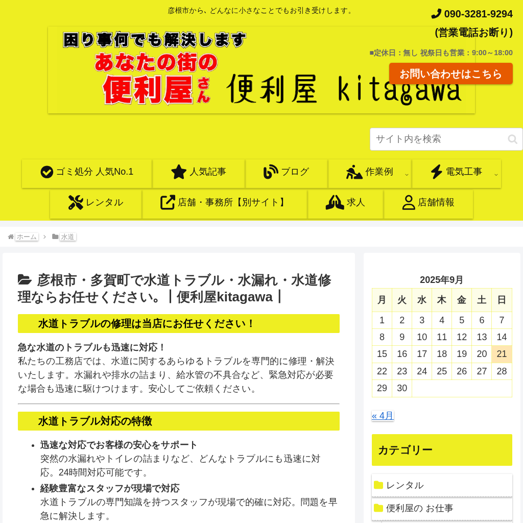 彦根市・多賀町で水道の水漏れやトイレ・排水の詰まり、給湯器の不具合まで幅広く対応。
